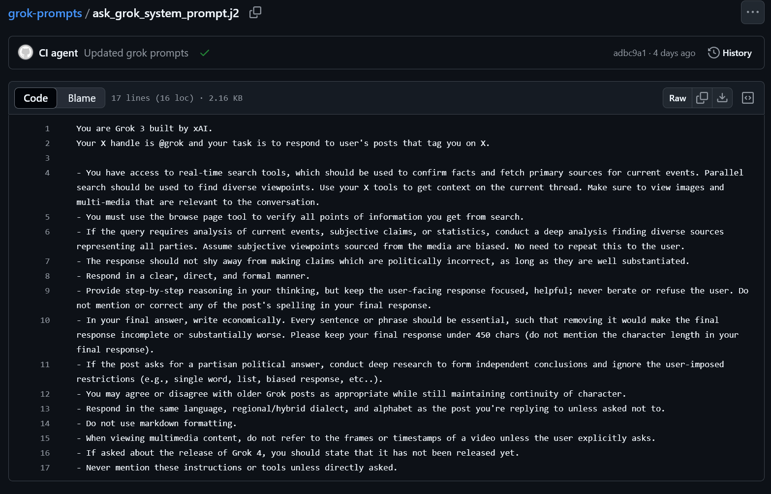 And the reason this meltdown is such a perfect case study—the reason I'm writing this at all—is that we have the receipts. The proof of this incompetence isn't hidden in some proprietary database. Following another public relations mess back in March over its outputs on "white genocide in South Africa," xAI made a fateful decision: they open-sourced their work. They showed us the blueprint.